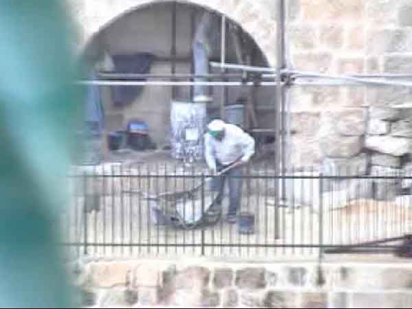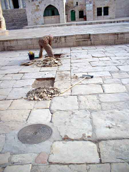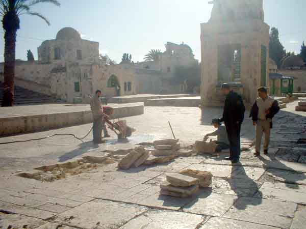 פירוק מרצפות וחפירה סמוך לכיפת הסלע. ככל הנראה מדובר בתיקון
