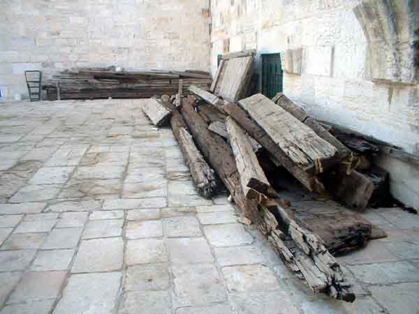 קורות עץ עתיקות שהוצאו ממסגד אל-אקצע במהלך החודשים האחרונים.