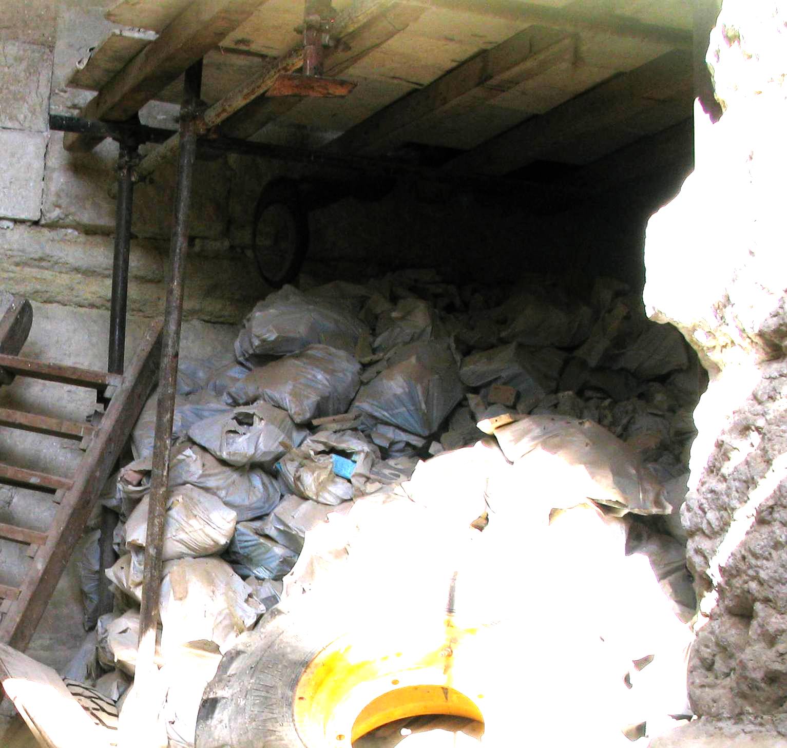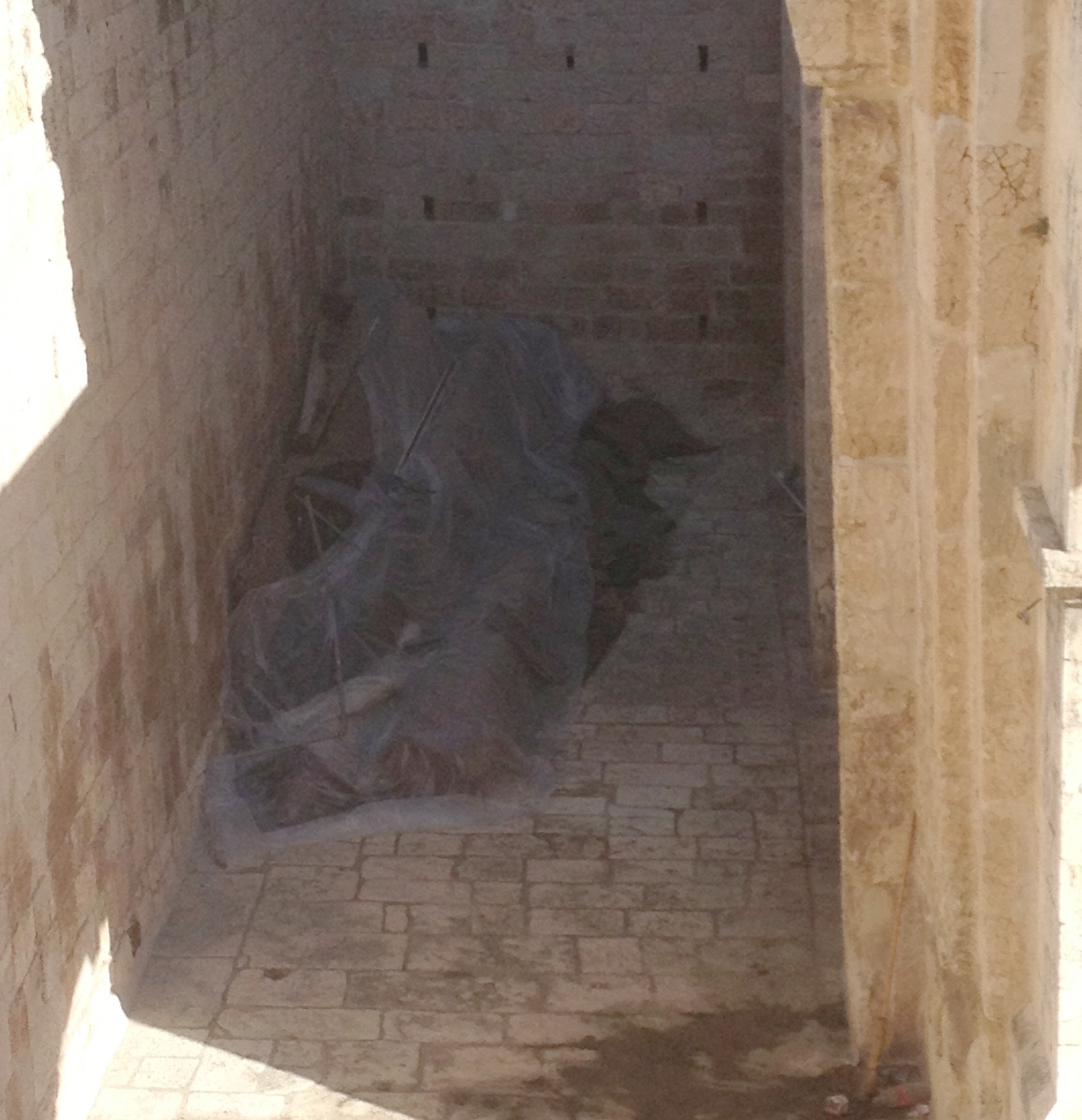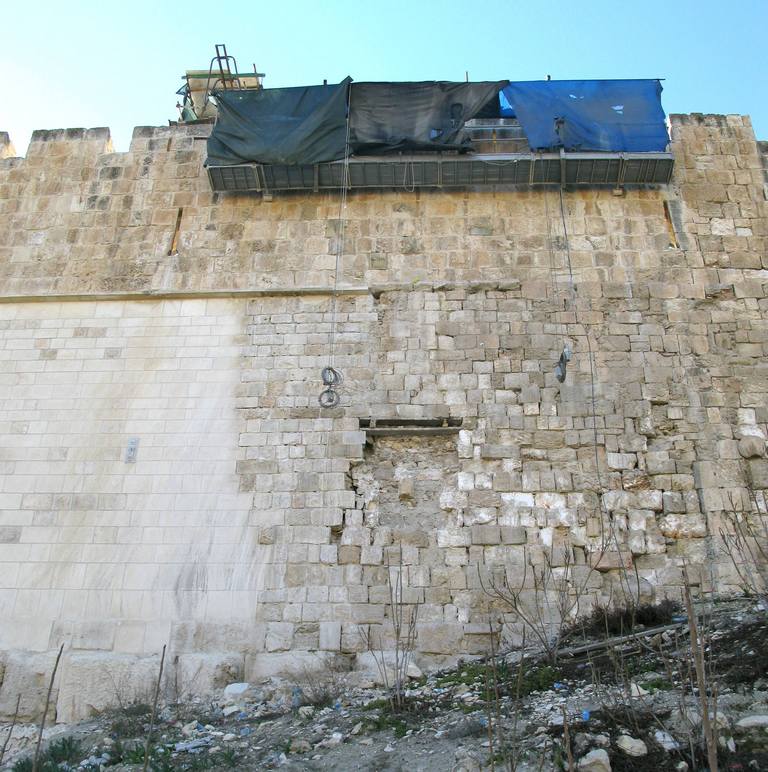מלבד זאת שמנו לב לכך שקורות העץ העתיקות ממסגד אל-אקצה המונחות בחצר שער הרחמים כוסו ביריעת פלסטיק. בדו"ח שפרסמנו בשבוע שעבר העלנו הצעה זו כפעולה מינימלית העשויה להטיב עם השתמרות הקורות, ונראה שהדברים הגיעו לאזניים קשובות. הבעיה כעת היא שהפלסטיק אינו מאפשר לעצים להתייבש. לכן יש צורך להניח אותם על משטחים מוגבהים תחילה, ואז לכסותם (איור 1).