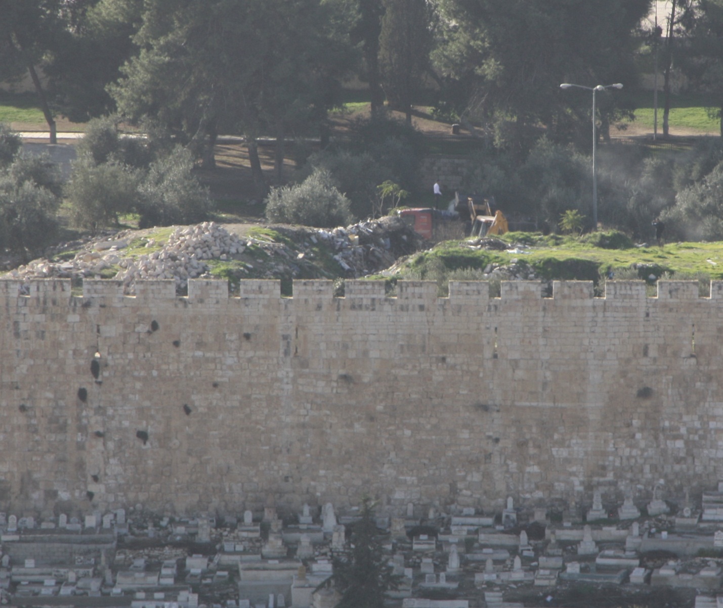 לאור זאת הצטברו באזור החורשה המזרחית בהר הבית תלוליות עפר גדולות והמקום נראה כיום כמזבלה (איור 1). המשטרה עד עתה הקפידה מאד על איסור פינוי העפר, אך לא הקפידה כלל על מניעת עבודות עפר בתלוליות אלו. מידי פעם הגיע למקום טרקטור שחפר והזיז את העפר ממקום למקום. הדבר סותר באופן מובהק את מהות העתירה לבג"ץ, שמטרתה היתה להציל את הממצא הארכיאולוגי הטמון בעפר זה מפגיעה נוספת של כלים מכניים כבדים. יש לציין, שבשמונה השנים האחרונות כותב מסמך זה וד"ר גבריאל ברקאי עומדים בראש פרויקט לסינון עפר שפונה מהר הבית בשנים 1999-2000. מהסינון עולה שעפר זה עשיר בממצאים ארכיאולוגים שזמנם החל מימי הבית הראשון ועד לימינו. כך לדוגמא נתגלו טביעות חותם של כהנים מימי הבית הראשון, אריחי ריצוף צבעוניים מהרחבה שהקיפה את בית המקדש בימי הבית השני, מסמרי פרסות, פרסות וראשי חצים מהמסדר הטמפלרי שהשכין את סוסיו באורוות שלמה, שרידי כתובות ערביות מהתקופה הערבית הקדומה והממלוכית ועוד….