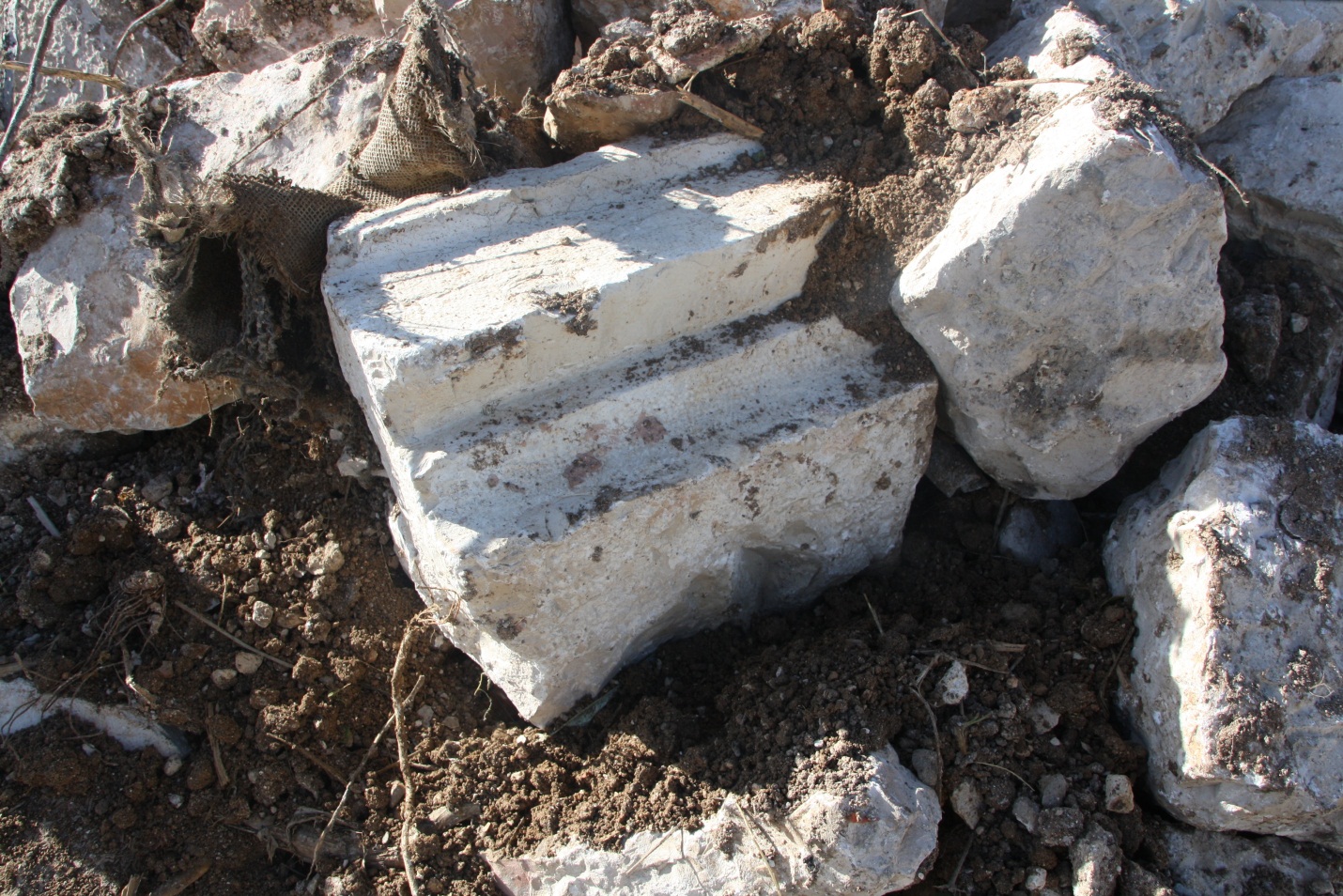 - איור 5: בין האבנים שהמשאית שפכה היו גם שברי אבנים ממבנים עתיקים. בתצלום מזוזת שער מימי הבית השני.