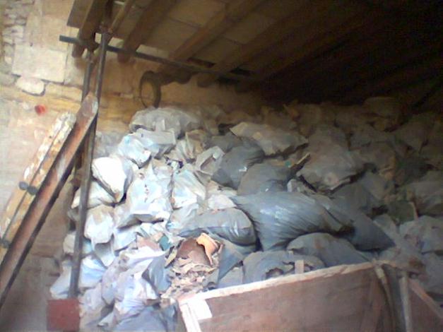 - איור 6: שקי הניילון המלאים בממצאים ארכיאולוגים מוסתרים מאחורי טרקטור בחדר פינתי בחומה הצפונית של הר הבית.