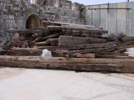 - איור 7: מערום קורות עץ עתיקים מונחים סמוך לכותל הדרומי לפני שהועברו לאזור שער הרחמים (צילום משנת 2007).