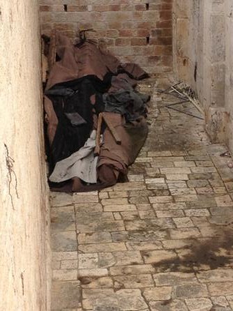- איור 8: קורות העץ הנותרות במיקומם החדש מכוסות בשטיחים וחשופות לגשמים.