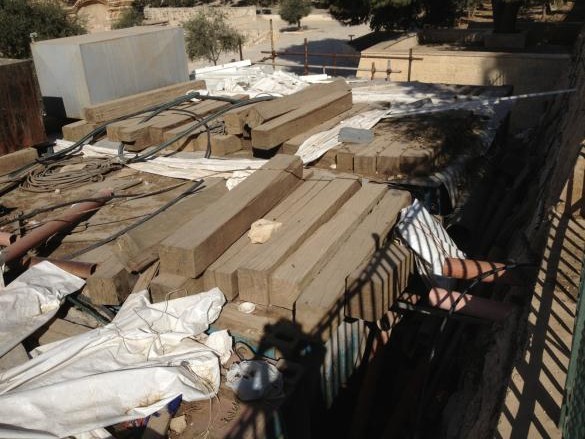 לאחרונה גילינו כי מרבית הקורות שנראו פזורים בשטח הר הבית בעשור הקודם מוחזרו לקורות עץ חדשות, ואוחסנו על גג מכולה בקרבת שער הרחמים (איור 9). במקום נראתה קבוצה של כ-40 קורות עם מרקם זהה לקורות הארזים הקדומות, כאשר החתך שלהם נראה יבש וסדוק (דבר המעיד על קדמותם של העצים). קורות אלו נוסרו מחדש ודפנותיהם יושרו והוחלקו.