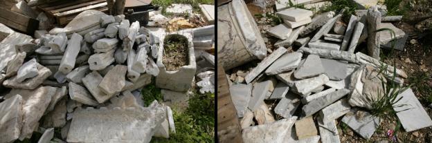 - איור 10: חלק ממערום גדול של פריטים ארכיטקטונים משיש שמקורם במבנים מהתקופה הביזנטית והערבית הקדומה.
