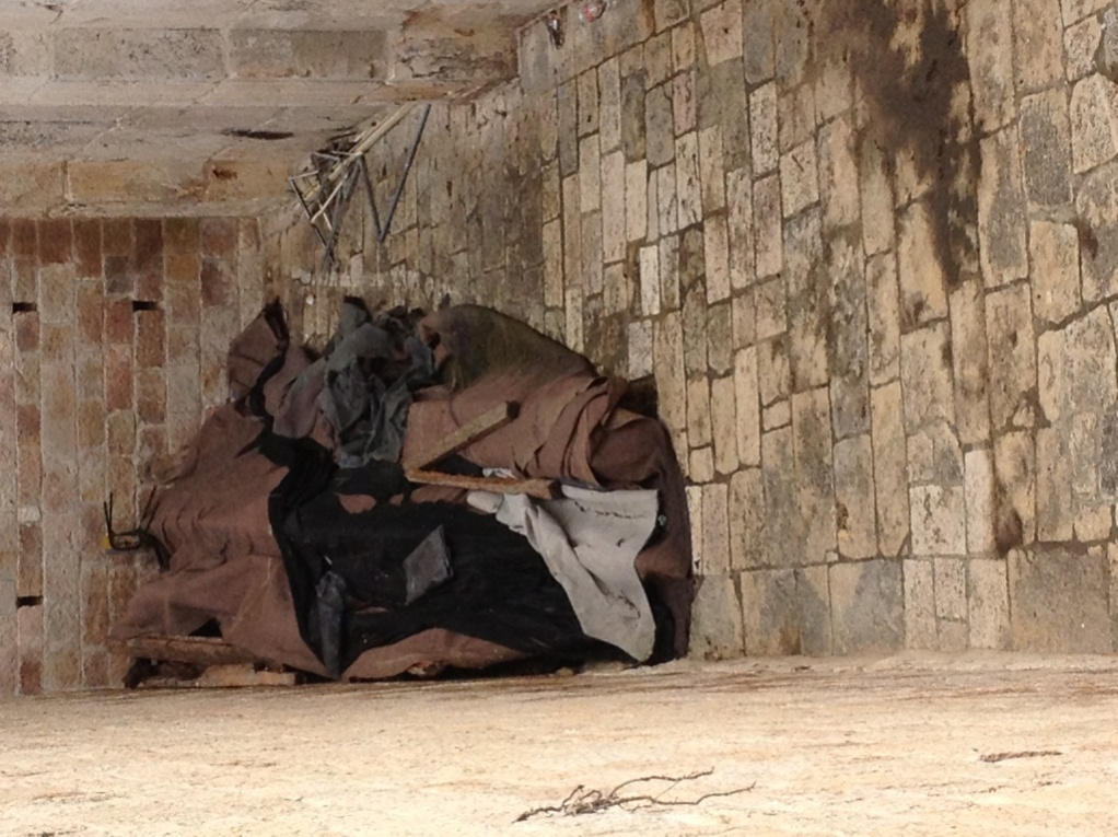 - Fig 3. The beams in their new location covered with rugs. (photo: Zachi Dvira)