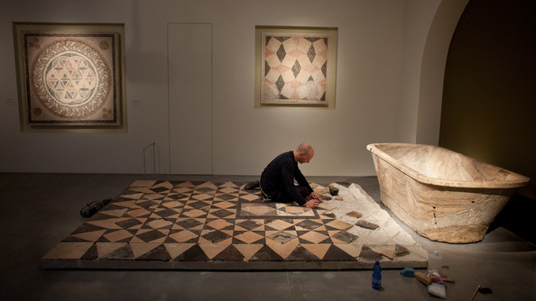 What is really interesting is how similar the quilt is to the floor created for the Israel Museum’s exhibit, “Herod the Great: The King’s Final Journey” that was on display in 2013. The museum display was created from tiles that were found at Herodium, where Herod was buried, and from Cypros, a small Herodian palace on the ridge-line above Jericho. Plaster replica tiles were then used to fill in the blank spaces.