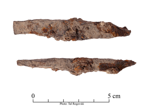 The crafts depend on one another: for the mason to shape the stone, he must rely on another artisan to produce a mason’s chisel for him. The ḥarash in the piyyut is the blacksmith—who forges iron in a blazing furnace and shapes it with hammer and anvil through repeated heating–quenching cycles. Iron tends to rust and disintegrate, so many items do not preserve well and sometimes are found as unidentifiable lumps; nevertheless, the sifting has yielded numerous iron artifacts preserved well enough for identification and even dating. Among them are nails of various sizes used to fasten wooden beams; arrowheads, spearheads, and perhaps swords; Crusader horseshoe nails known as “fiddle-key nails”; hobnails from Roman soldiers’ sandals (caligae); pegs, and more.